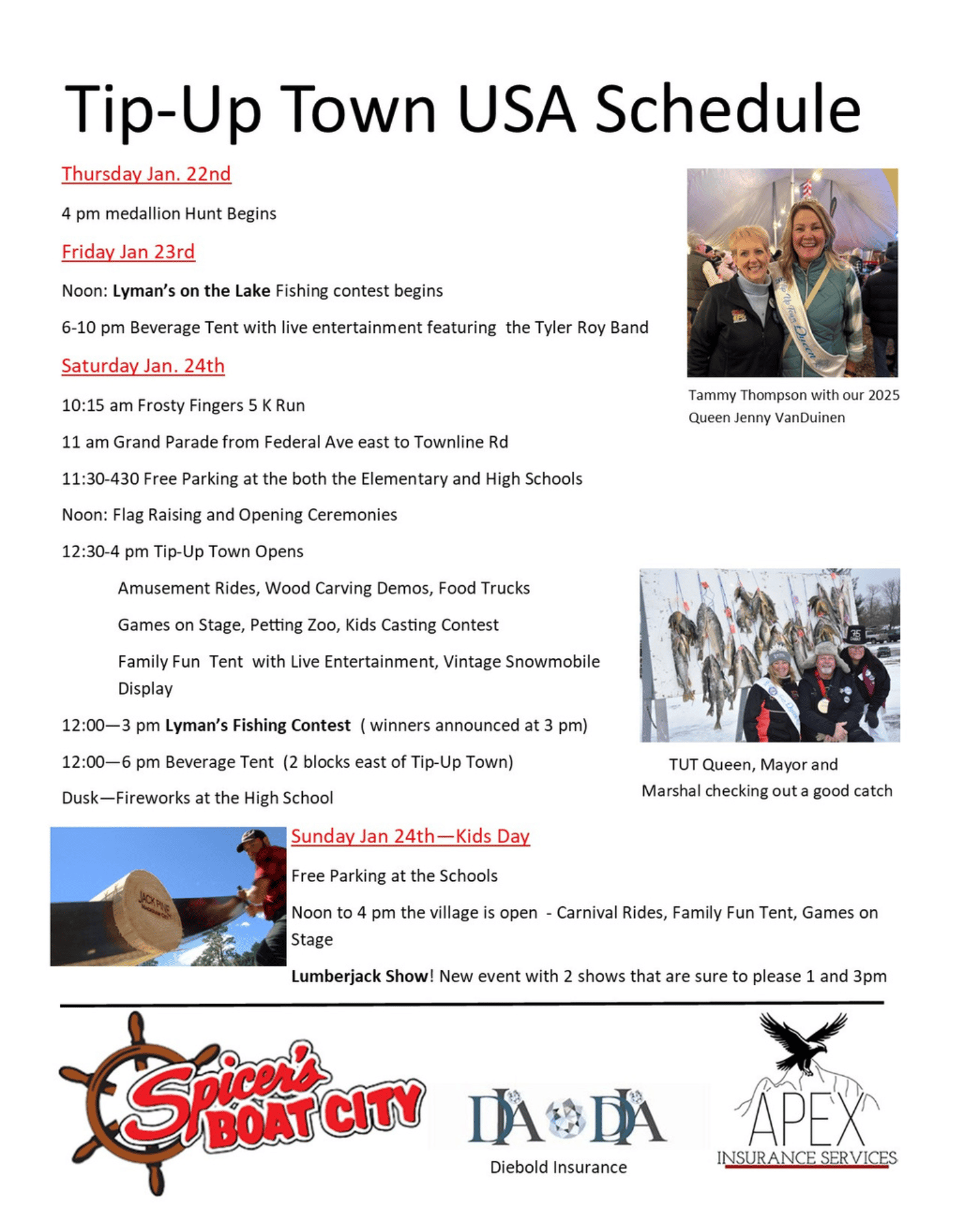 Tip Up Town USA is an Annual Festival of Ice Fishing and Family Fun activities held the last two weekends of January at Houghton Lake, Mi. TheTheme this year is Spirit of 76. Contact the Houghton Lake Chamber of Commerce for information at houghtonlakechamber.net or 989-366-5644
